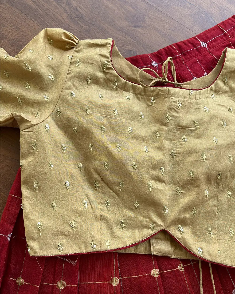 The golden crop top adds a radiant glow with its subtle shimmer, beautifully complemented by the rich maroon silk skirt that flows gracefully with every step. The cotton lining ensures maximum comfort and breathability, while the silk texture gives the outfit a luxurious finish. This set is perfect for those who love a blend of classic elegance and contemporary flair.