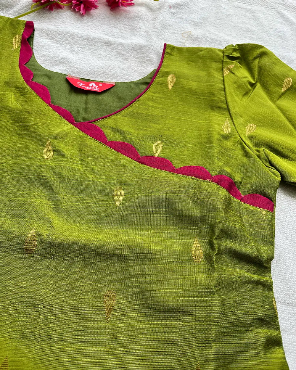 This Green Slub Silk Kurta Set is a timeless addition to your ethnic wardrobe, designed for festive occasions, celebrations, and stylish daywear. Crafted from rich slub silk fabric, the set includes a kurta, matching bottom, and pant, offering a refined silhouette with a soft, textured finish.