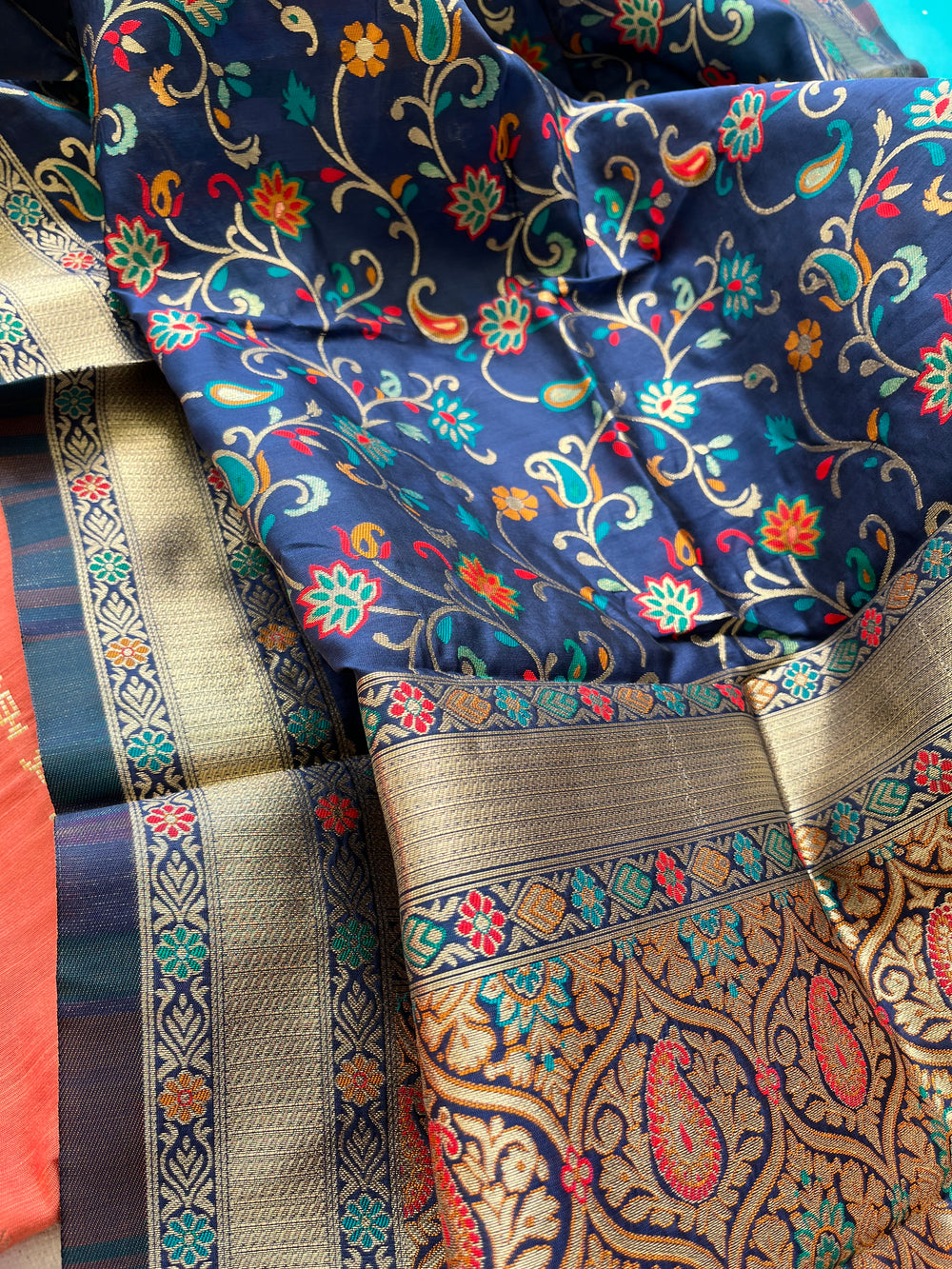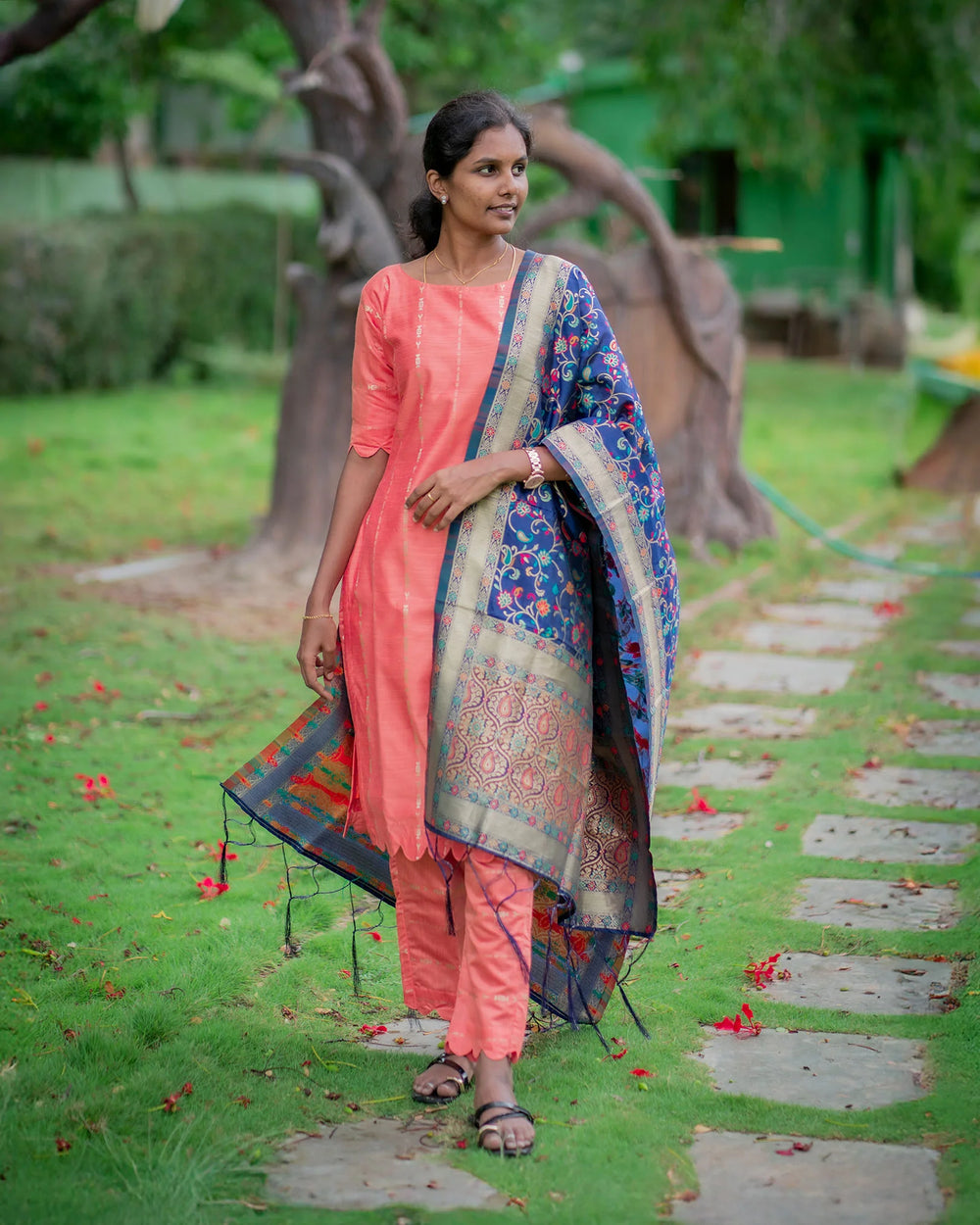 Add timeless grace to your ethnic wardrobe with this Peach Slub Silk Kurta Set, crafted with elegance and comfort in mind. The set includes a stylish kurta, pant, and a contrasting Banaras navy blue floral dupatta that enhances the overall charm with its rich weave.