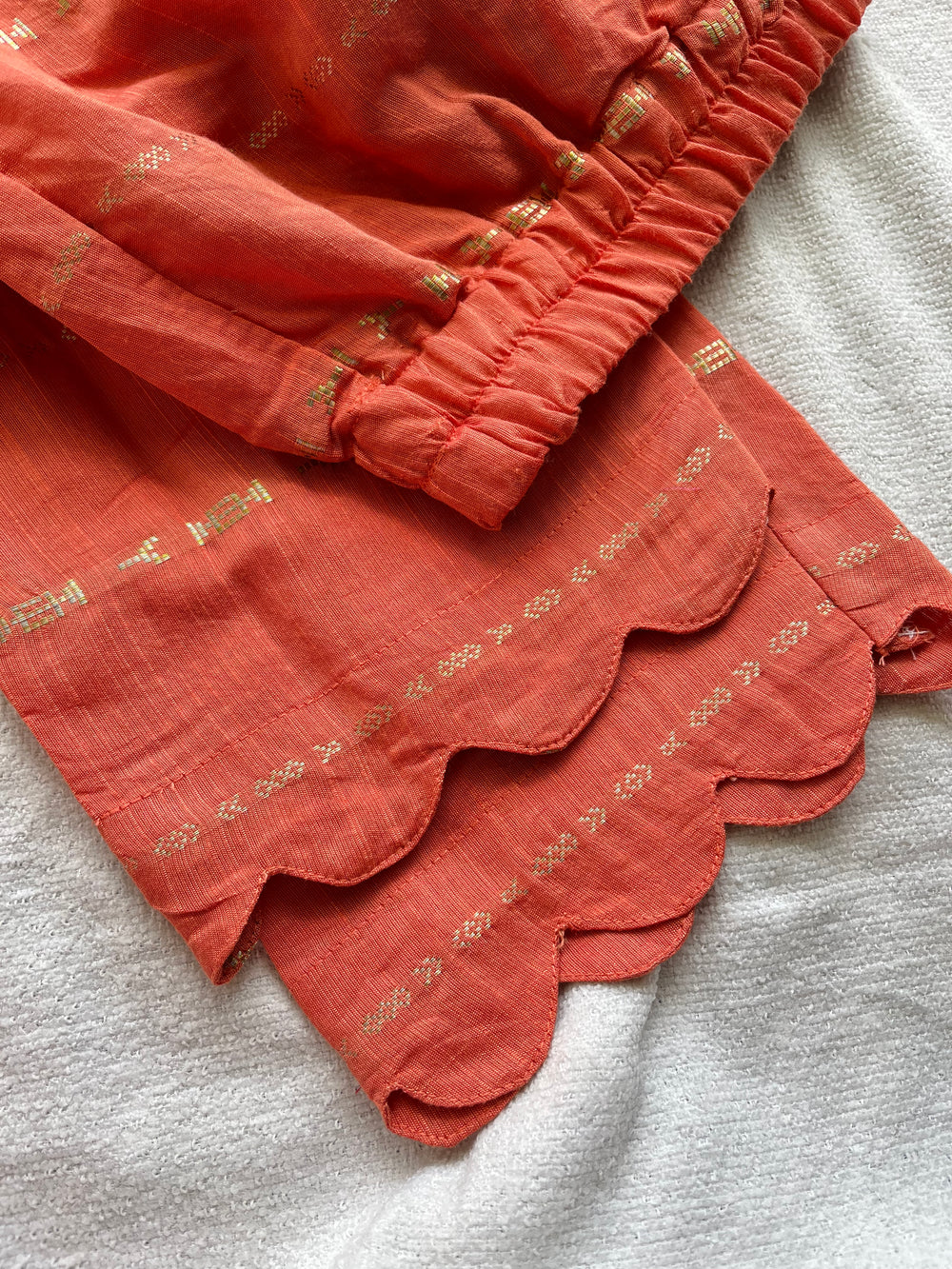 Elevate your festive look with this peach slub silk kurta set with Banaras dupatta – where traditional craftsmanship meets everyday comfort.