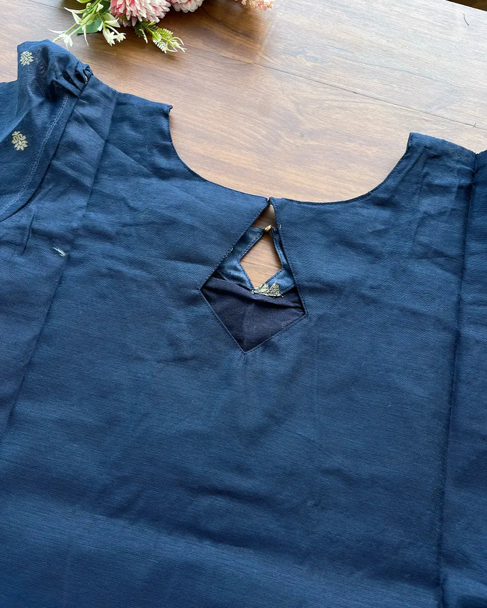 Step into elegance with our Premium Banaras Cotton Kurta Set in Midnight Blue (Top & Dupatta) – a rich and timeless ensemble perfect for festive and special occasions. The luxurious Banaras cotton fabric carries a soft sheen and intricate woven detailing, making it a classic statement piece in your ethnic collection.