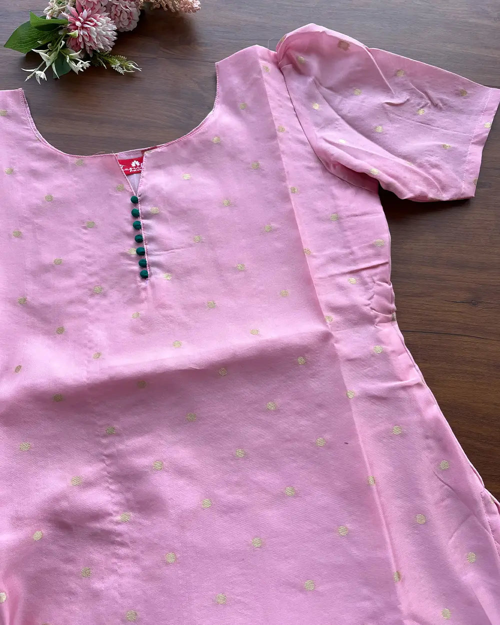 Crafted in a graceful misty rose shade, this kurta set is tailored in premium art silk for an elegant drape and subtle sheen. The set includes a beautifully designed top and a matching dupatta, making it a perfect pick for festive and special occasions. Soft cotton lining is attached for added comfort and finish.