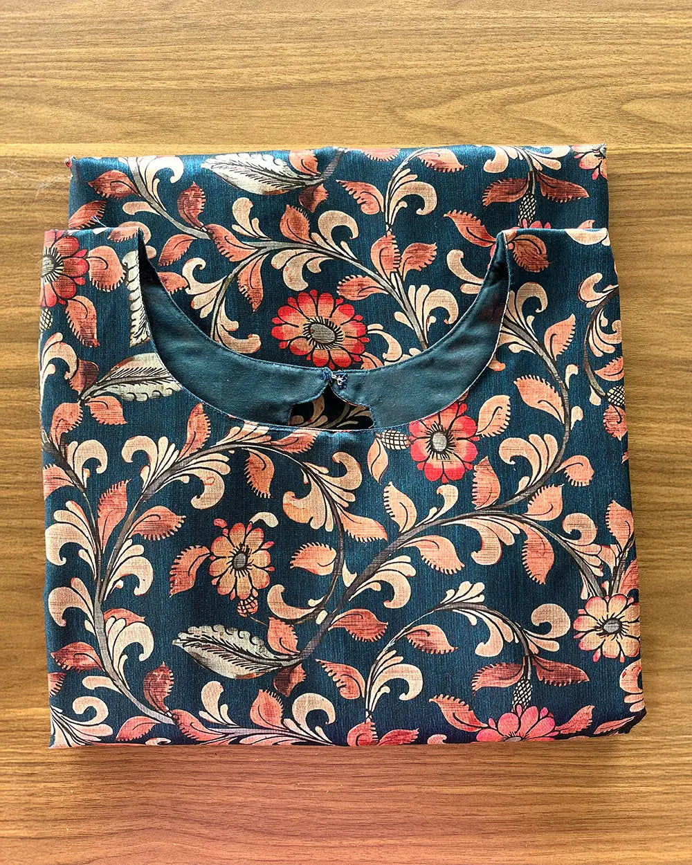 Embrace timeless elegance with our Premium Assam Silk Kurta, featuring a rich teal background adorned with intricate Kalamkari floral prints. This kurta blends artisanal heritage with modern-day comfort, making it a versatile piece for both festive and everyday wear.