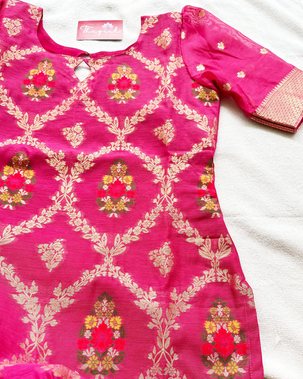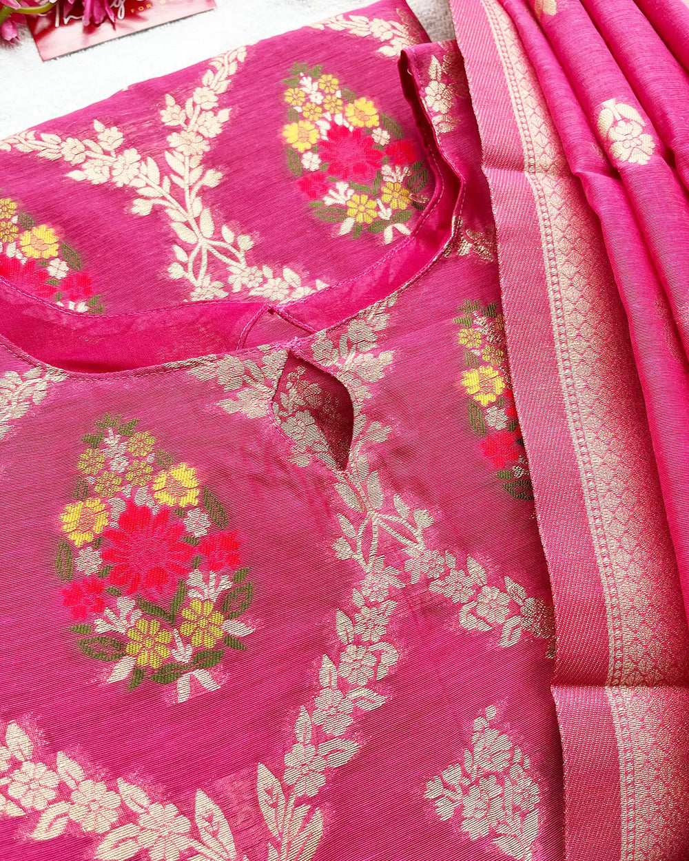 Banaras Cotton Kurta Set (Top–Pant–Dupatta) – Hot Pink Elegance