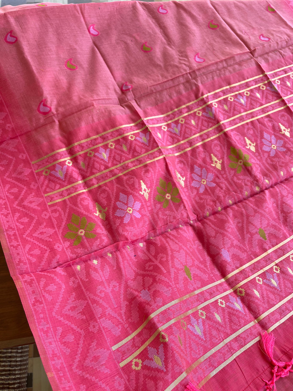 Grace your wardrobe with this Soft Chanderi Cotton Kurta Set, a perfect blend of traditional charm and contemporary elegance. The kurta features subtle woven motifs in soothing pink tones, beautifully complemented by a matching dupatta adorned with delicate zari-inspired patterns. Crafted from premium Chanderi cotton, this set ensures a soft, airy feel with a graceful drape — ideal for festive gatherings or elegant daytime outings.